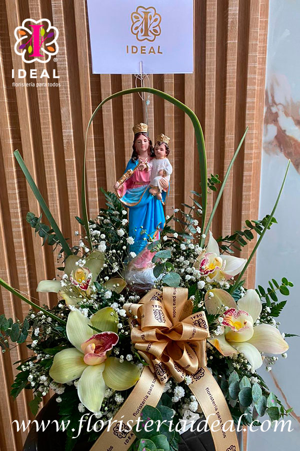 hermoso arreglo pequeño, con orquideas y una gran variedad de follaje, con una virgen hermosa