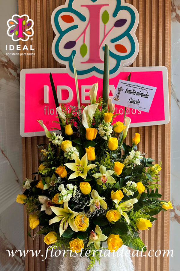 delicado arreglo floral para condolencias, en rosa amarilla y lirios en forma de abanico, en una base de ceramica